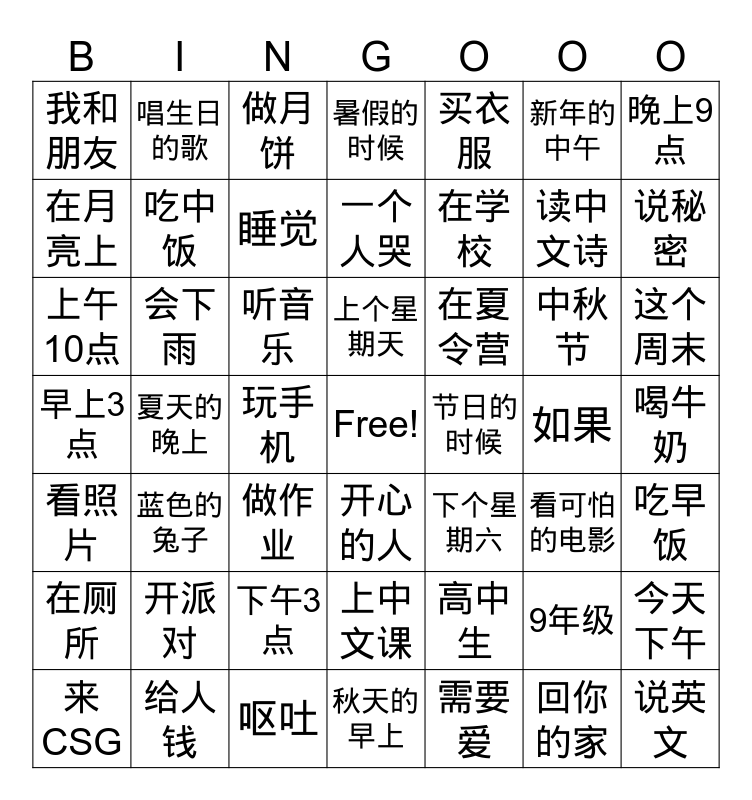 This bingo card has a free space and 48 words: 高中生, 读中文诗, 秋天的早上, 夏天的晚上, 听音乐, 喝牛奶, 唱生日的歌, 给人钱, 新年的中午, 开心的人, 晚上9点, 暑假的时候, 中秋节, 在夏令营, 在厕所, 如果, 在月亮上, 说秘密, 9年级, 买衣服, 在学校, 玩手机, 我和朋友, 吃中饭, 今天下午, 睡觉, 这个周末, 来CSG, 上个星期天, 会下雨, 回你的家, 节日的时候, 吃早饭, 开派对, 早上3点, 下个星期六, 看可怕的电影, 上午10点, 做作业, 下午3点, 看照片, 说英文, 做月饼, 呕吐, 一个人哭, 上中文课, 蓝色的兔子 and 需要爱.