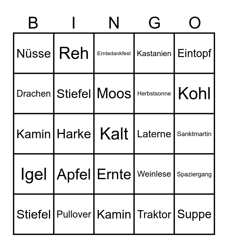 This bingo card has a free space and 54 words: Blätter, Igel, Regen, Wald, Ernte, Eichhörnchen, Kastanien, Trauben, Drachen, Pilze, Nüsse, Bären, Pullover, Stiefel, Wind, Kamin, Suppe, Herbstsonne, Kürbis, Sanktmartin, Weinlese, Wildgänse, Laterne, Eintopf, Fuchs, Reh, Regentropfen, Zwetschkenkuchen, Backen, Traktor, Bunt, Markt, Laubbläser, Laubhaufen, Erntedankfest, Dämmerung, Kamin, Spaziergang, Regenjacke, Stiefel, Mütze, Schal, Nüsse, Birne, Apfel, Eichel, Laub, Sturm, Moos, Harke, Kohl, Rüben, Krähe and Grau.