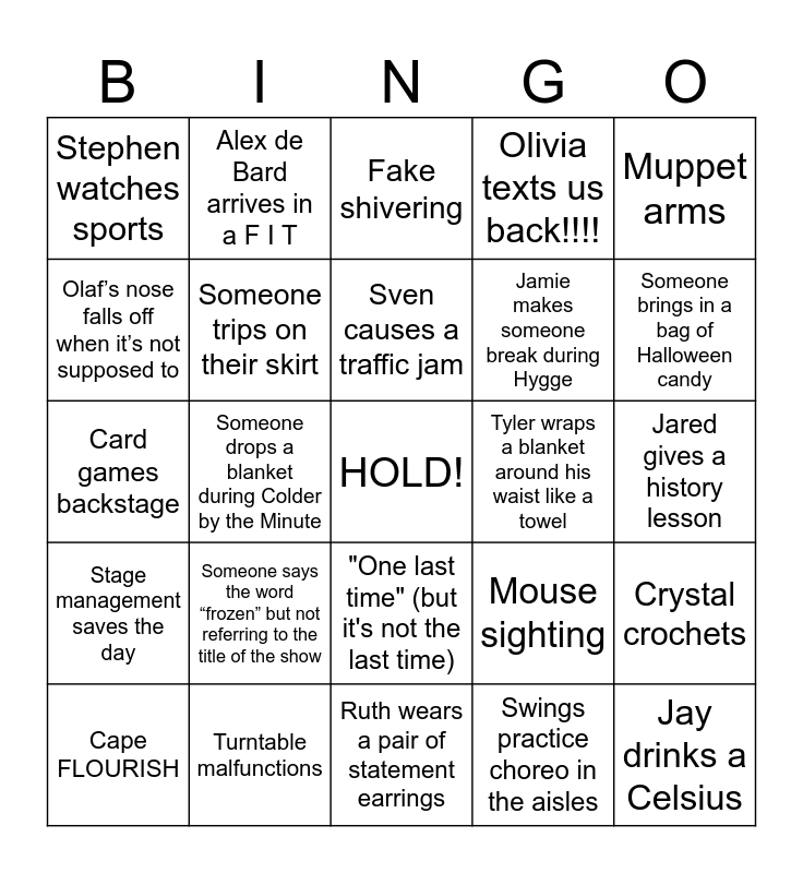 This bingo card has a free space and 24 words: Someone says the word “frozen” but not referring to the title of the show, Turntable malfunctions, Sven causes a traffic jam, Cape FLOURISH, Muppet arms, Stephen watches sports, Olaf’s nose falls off when it’s not supposed to, Alex de Bard arrives in a F I T, Tyler wraps a blanket around his waist like a towel, "One last time" (but it's not the last time), Jamie makes someone break during Hygge, Card games backstage, Mouse sighting, Crystal crochets, Someone trips on their skirt, Swings practice choreo in the aisles, Jared gives a history lesson, Fake shivering, Someone brings in a bag of Halloween candy, Someone drops a blanket during Colder by the Minute, Jay drinks a Celsius, Stage management saves the day, Olivia texts us back!!!! and Ruth wears a pair of statement earrings.
