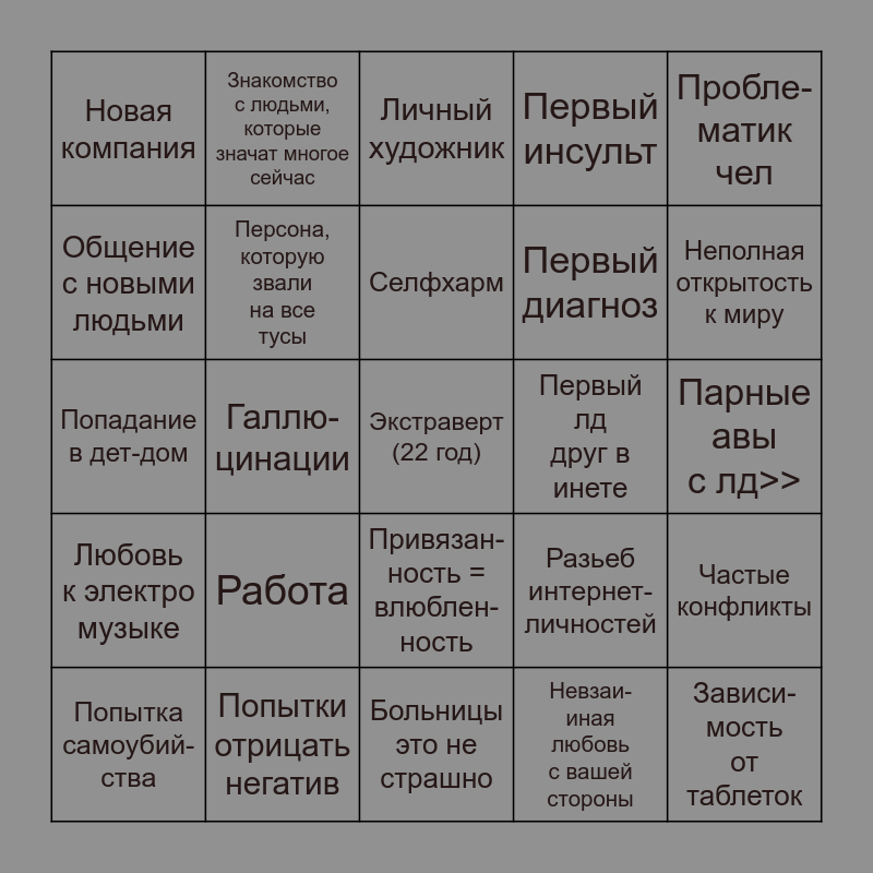 This bingo card has a free space and 24 words: Работа, Попытки отрицать негатив, Селфхарм, Попытка самоубий- ства, Пробле- матик чел, Новая компания, Общение с новыми людьми, Знакомство с людьми, которые значат многое сейчас, Первый лд друг в инете, Привязан- ность = влюблен- ность, Первый диагноз, Попадание в дет-дом, Разьеб интернет- личностей, Частые конфликты, Персона, которую звали на все тусы, Невзаи- иная любовь с вашей стороны, Парные авы с лд>>, Личный художник, Неполная открытость к миру, Галлю- цинации, Зависи- мость от таблеток, Любовь к электро музыке, Первый инсульт and Больницы это не страшно.