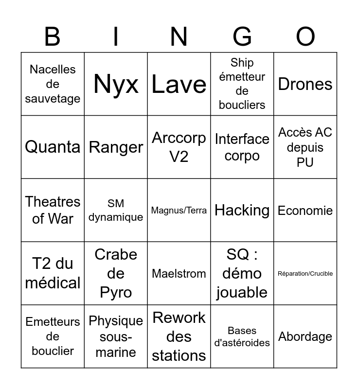 This bingo card has a free space and 24 words: Crabe de Pyro, Physique sous-marine, Arccorp V2, Emetteurs de bouclier, Drones, Nacelles de sauvetage, Quanta, Nyx, Hacking, Maelstrom, Interface corpo, Theatres of War, SQ : démo jouable, Réparation/Crucible, Ranger, Bases d'astéroides, Economie, Lave, Accès AC depuis PU, SM dynamique, Abordage, T2 du médical, Ship émetteur de boucliers and Rework des stations.