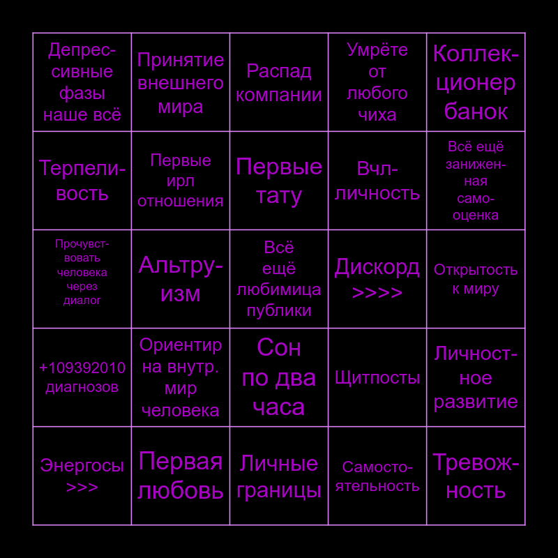 This bingo card has a free space and 24 words: Ориентир на внутр. мир человека, Первая любовь, Первые тату, Энергосы >>>, Коллек- ционер банок, Депрес- сивные фазы наше всё, Терпели- вость, Принятие внешнего мира, Дискорд >>>>, Сон по два часа, Вчл- личность, Прочувст- вовать человека через диалог, Щитпосты, Личност- ное развитие, Первые ирл отношения, Самосто- ятельность, Открытость к миру, Распад компании, Всё ещё занижен- ная само- оценка, Альтру- изм, Тревож- ность, +109392010 диагнозов, Умрёте от любого чиха and Личные границы.