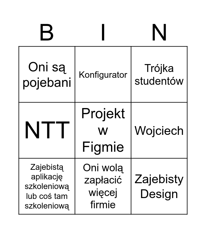 This bingo card has a free space and 11 words: Stary kurwa, Mój stary, Wojciech, Zajebistą aplikację szkoleniową lub coś tam szkoleniową, Trójka studentów, Oni są pojebani, Oni wolą zapłacić więcej firmie, Zajebisty Design, NTT, Konfigurator and SKBD.