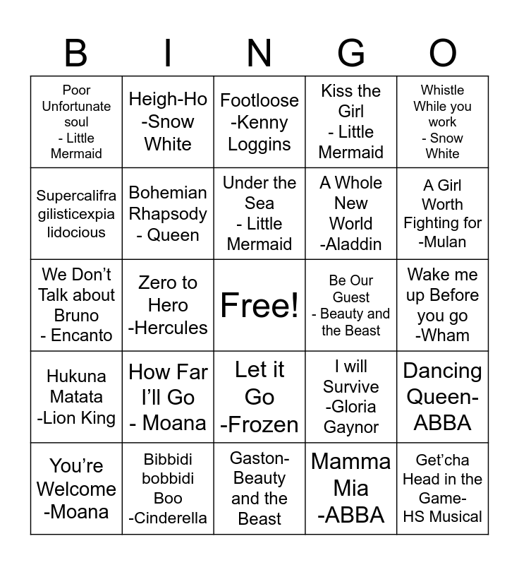 This bingo card has a free space and 24 words: How Far I’ll Go - Moana, Bibbidi bobbidi Boo -Cinderella, Under the Sea - Little Mermaid, You’re Welcome -Moana, Whistle While you work - Snow White, Poor Unfortunate soul - Little Mermaid, Supercalifra gilisticexpia lidocious, Heigh-Ho -Snow White, Be Our Guest - Beauty and the Beast, Let it Go -Frozen, A Whole New World -Aladdin, We Don’t Talk about Bruno - Encanto, I will Survive -Gloria Gaynor, Dancing Queen-ABBA, Bohemian Rhapsody - Queen, Mamma Mia -ABBA, Wake me up Before you go -Wham, Footloose -Kenny Loggins, A Girl Worth Fighting for -Mulan, Zero to Hero -Hercules, Get’cha Head in the Game- HS Musical, Hukuna Matata -Lion King, Kiss the Girl - Little Mermaid and Gaston-Beauty and the Beast.
