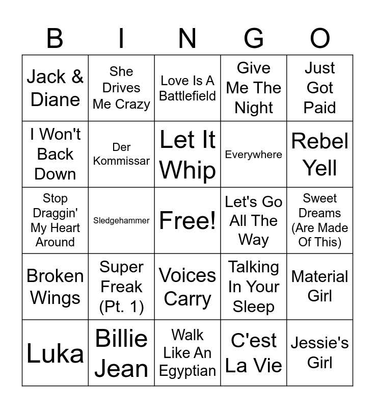 This bingo card has a free space and 60 words: (I Just) Died In Your Arms Tonight, Billie Jean, Break My Stride, Broken Wings, C'est La Vie, Come On Eileen, Der Kommissar, Drive, Everywhere, Freeze-Frame, Give Me The Night, I Can't Wait, I Won't Back Down, I'm Still Standing, It's Still Rock And Roll To Me, Jack & Diane, Jessie's Girl, Just Got Paid, Keep On Loving You, Let It Whip, Let's Go All The Way, Love Is A Battlefield, Luka, Material Girl, Miami Vice Theme, Morning Train (Nine To Five), No One Is To Blame, Purple Rain, Rebel Yell, Relax, Rhythm Is Gonna, Road To Nowhere, Rock Steady, Sexual Healing, She Drives Me Crazy, Shining Star, Sister Christian, Sledgehammer, Start Me Up, Stop Draggin' My Heart Around, Sunglasses At Night, Super Freak (Pt. 1), Sweet Dreams (Are Made Of This), Take On Me, Talking In Your Sleep, The Flame, The Tide Is High, The Way It Is, True, Voices Carry, Walk Like An Egyptian, Walk Of Life, We Got The Beat, What's Love Got To Do With It, When I See You Smile, Wild Thing, Wild, Wild West, Wishing Well, You Make My Dreams (Come True) and Your Love.