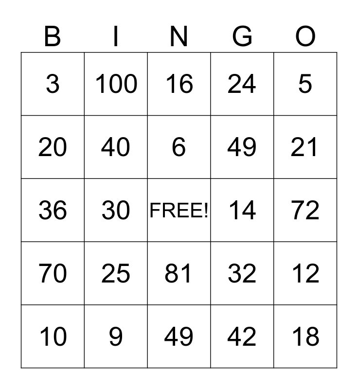 This bingo card has a free space and 24 words: 25, 9, 6, 10, 5, 3, 20, 100, 14, 81, 49, 36, 32, 12, 40, 42, 72, 16, 21, 30, 18, 70, 24 and 49.