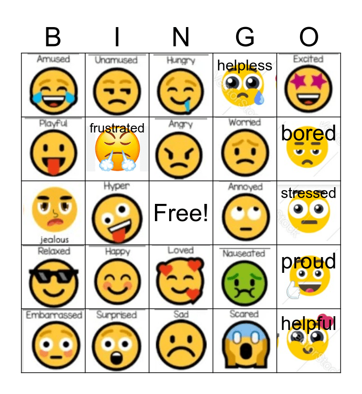 This bingo card has 24 images, a free space and 6 words: proud, frustrated, stressed, bored, helpful and helpless.