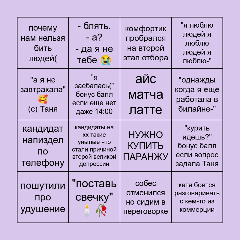 This bingo card has 16 words: "поставь свечку" 🕯️🥀, "курить идешь?" бонус балл если вопрос задала Таня, комфортик пробрался на второй этап отбора, почему нам нельзя бить людей(, кандидат напиздел по телефону, - блять. - а? - да я не тебе 😭, НУЖНО КУПИТЬ ПАРАНЖУ, собес отменился но сидим в переговорке, "а я не завтракала" 🥰 (с) Таня, "я заебалась(" бонус балл если еще нет даже 14:00, пошутили про удушение, "я люблю людей я люблю людей я люблю-", кандидаты на хх такие унылые что стали причиной второй великой депрессии, "однажды когда я еще работала в билайне-", айс матча латте and катя боится разговаривать с кем-то из коммерции.
