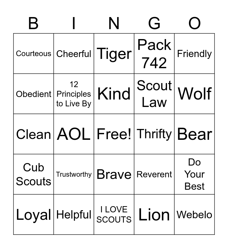 This bingo card has a free space and 24 words: Trustworthy, Helpful, Kind, Loyal, Friendly, Courteous, Obedient, Cheerful, Thrifty, Brave, Scout Law, Clean, Reverent, Do Your Best, 12 Principles to Live By, Lion, Bear, Tiger, Wolf, AOL, Webelo, Cub Scouts, Pack 742 and I LOVE SCOUTS.