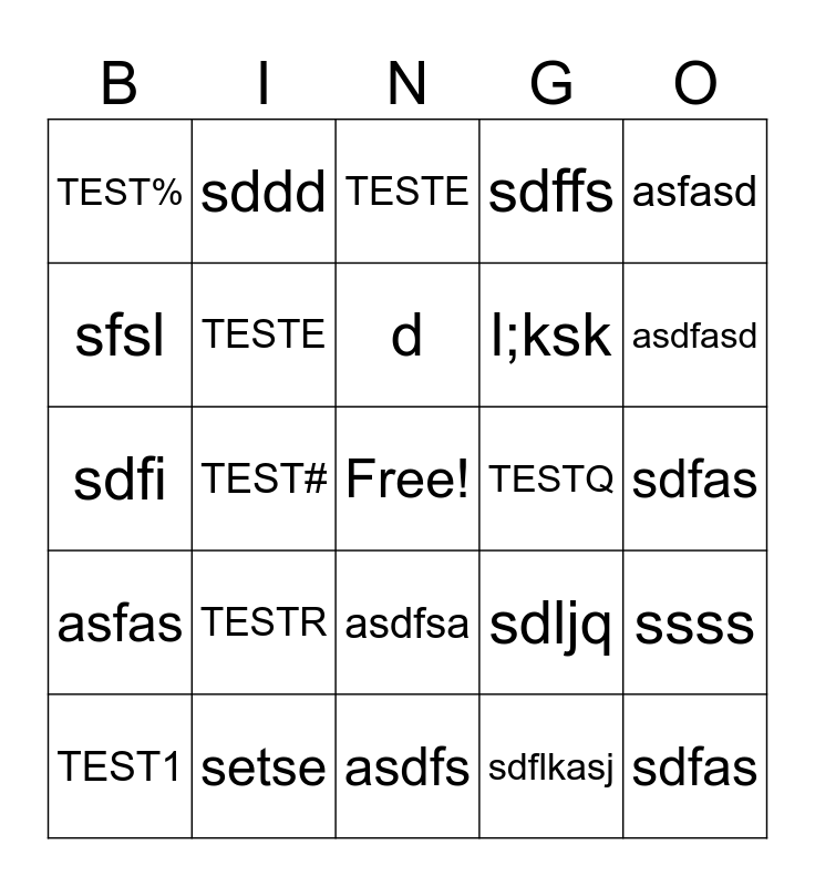 This bingo card has a free space and 29 words: TEST1, TEST@, TEST#, TEST$, TEST%, TESTE, TESTE, TESTR, TESTQ, setse, sdfas, sdfas, asdfs, sdflkasj, asdfasd, asdfas, asdfsa, asfas, asfasd, sdfi, sdljq, sas;kj, l;ksk, sfsl, sdffs, sddd, ssss, d and sss.