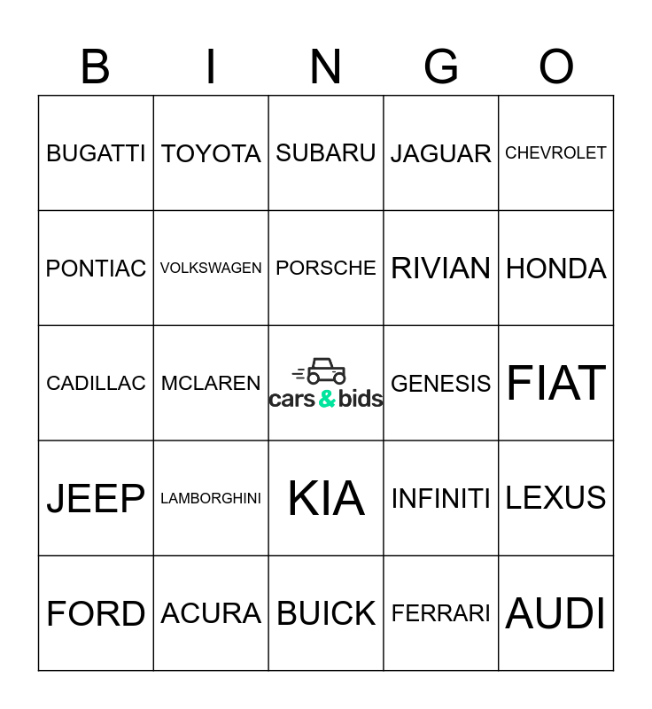 This bingo card has a free space and 45 words: BMW, AUDI, BENTLEY, FORD, ALFA ROMERO, FERRARI, SUBARU, ASTON MARTIN, CHEVROLET, ACURA, JAGUAR, GENESIS, KIA, LAMBORGHINI, HYUNDAI, BUICK, ACURA, CADILLAC, CHRYSLER, HONDA, TOYOTA, JEEP, FISKER, BUGATTI, DODGE, FIAT, GMC, HUMMER, INFINITI, JEEP, LAND ROVER, LEXUS, LINCOLN, LOTUS, MASERATI, MCLAREN, MERCEDES, MITSUBISHI, NISSAN, PORSCHE, PONTIAC, RIVIAN, ROLLS-ROYCE, VOLKSWAGEN and TESLA.