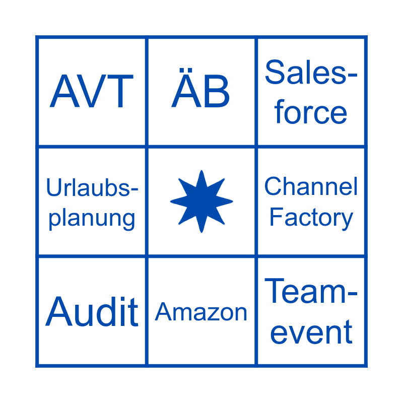 This bingo card has a free space and 8 words: Channel Factory, Sales-force, ÄB, Audit, AVT, Team-event, Urlaubs-planung and Amazon.