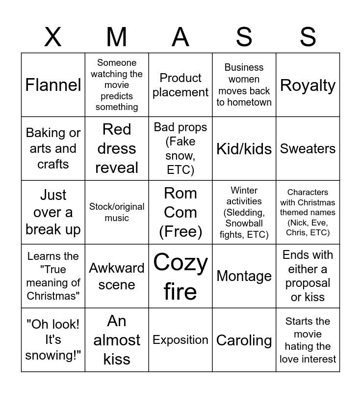 This bingo card has a free space and 38 words: Someone pushing the relationship, Magical element, "I'm not like other girls" character, Red dress reveal, Ends with either a proposal or kiss, Awkward scene, Bad props (Fake snow, ETC), Missed flight, Royalty, Kid/kids, Stock/original music, Business women moves back to hometown, Starts the movie hating the love interest, Characters with Christmas themed names (Nick, Eve, Chris, ETC), Baking or arts and crafts, Learns the "True meaning of Christmas", Gives to the needy, Product placement, Bad Writing/ dialogue, Winter activities (Sledding, Snowball fights, ETC), Flannel, An almost kiss, Sweaters, "Oh look! It's snowing!", Dead family member, Exposition, "Wait! I can explain!", Messy meet-cute, Childhood stories, Quits job, Romantic fall, Cozy fire, Caroling, Someone watching the movie predicts something, Competiton, Montage, Just over a break up and Diner.