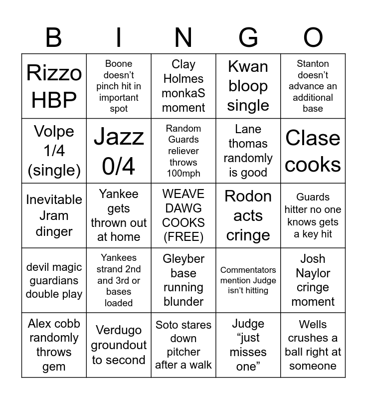 This bingo card has a free space and 24 words: Yankees strand 2nd and 3rd or bases loaded, Verdugo groundout to second, Random Guards reliever throws 100mph, Alex cobb randomly throws gem, Stanton doesn’t advance an additional base, Rizzo HBP, Volpe 1/4 (single), Boone doesn’t pinch hit in important spot, Rodon acts cringe, Gleyber base running blunder, Lane thomas randomly is good, Inevitable Jram dinger, Commentators mention Judge isn’t hitting, Josh Naylor cringe moment, Jazz 0/4, Judge “just misses one”, Guards hitter no one knows gets a key hit, Clay Holmes monkaS moment, Clase cooks, Yankee gets thrown out at home, Wells crushes a ball right at someone, devil magic guardians double play, Kwan bloop single and Soto stares down pitcher after a walk.