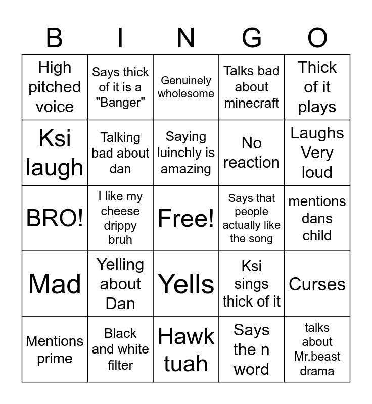 This bingo card has a free space and 24 words: Yelling about Dan, Black and white filter, Saying luinchly is amazing, Mentions prime, Thick of it plays, High pitched voice, Ksi laugh, Says thick of it is a "Banger", Says that people actually like the song, Yells, No reaction, BRO!, Ksi sings thick of it, Curses, Talking bad about dan, Says the n word, mentions dans child, Genuinely wholesome, Laughs Very loud, I like my cheese drippy bruh, talks about Mr.beast drama, Mad, Talks bad about minecraft and Hawk tuah.