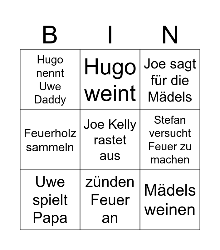 This bingo card has a free space and 8 words: Stefan versucht Feuer zu machen, Joe sagt für die Mädels, Hugo weint, Uwe spielt Papa, Hugo nennt Uwe Daddy, Mädels weinen, Feuerholz sammeln and zünden Feuer an.