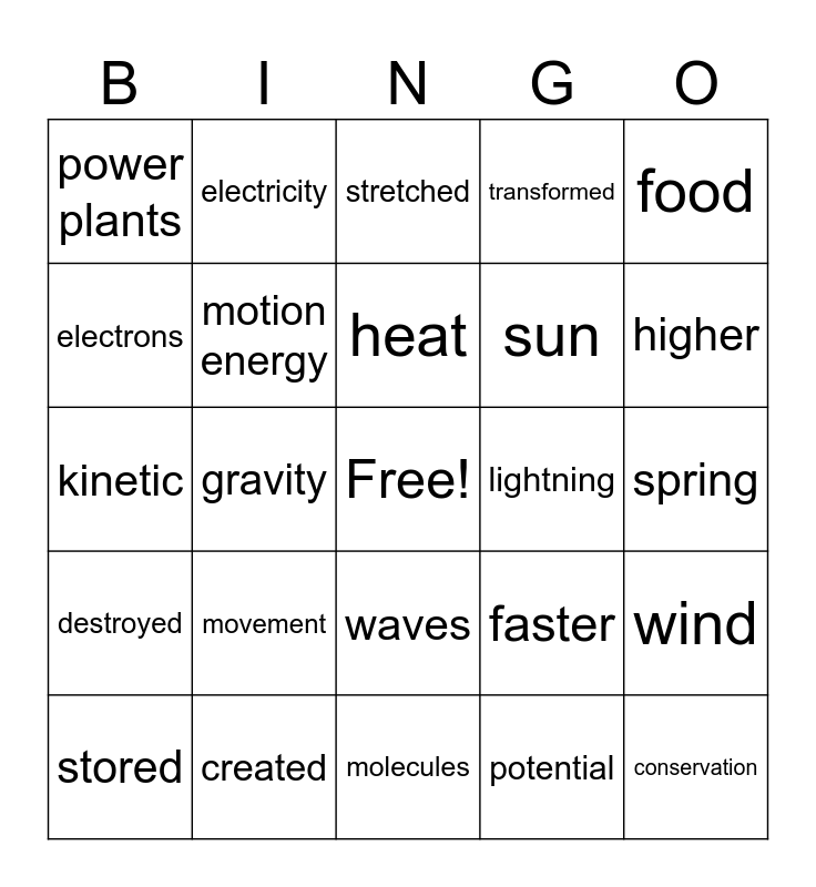 This bingo card has a free space and 25 words: movement, molecules, heat, stored, food, power plants, electrons, electricity, lightning, waves, sun, kinetic, faster, wind, motion energy, vibrate, spring, stretched, higher, gravity, conservation, created, destroyed, transformed and potential.