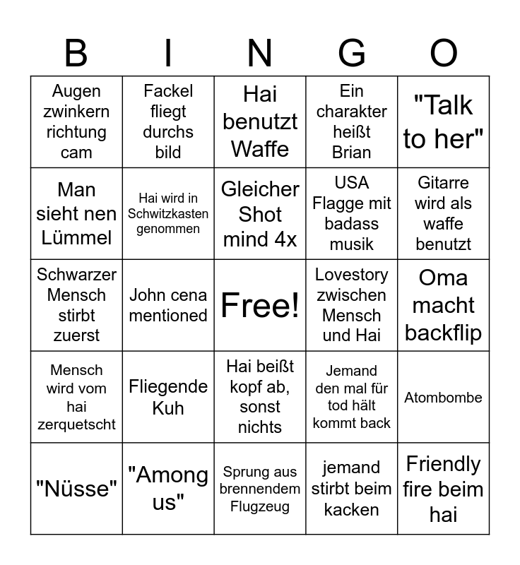This bingo card has a free space and 24 words: "Nüsse", Fliegende Kuh, Gleicher Shot mind 4x, jemand stirbt beim kacken, "Talk to her", Augen zwinkern richtung cam, Fackel fliegt durchs bild, Hai benutzt Waffe, Lovestory zwischen Mensch und Hai, Oma macht backflip, Schwarzer Mensch stirbt zuerst, Hai wird in Schwitzkasten genommen, Jemand den mal für tod hält kommt back, Atombombe, Man sieht nen Lümmel, "Among us", Sprung aus brennendem Flugzeug, Ein charakter heißt Brian, Gitarre wird als waffe benutzt, Mensch wird vom hai zerquetscht, John cena mentioned, Hai beißt kopf ab, sonst nichts, USA Flagge mit badass musik and Friendly fire beim hai.