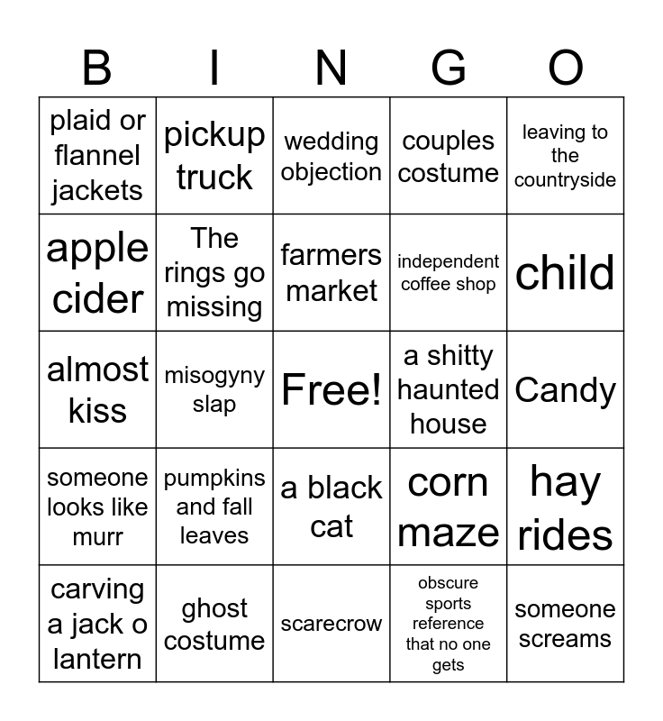 This bingo card has a free space and 24 words: pumpkins and fall leaves, ghost costume, farmers market, carving a jack o lantern, leaving to the countryside, plaid or flannel jackets, apple cider, pickup truck, a shitty haunted house, a black cat, independent coffee shop, almost kiss, corn maze, hay rides, The rings go missing, obscure sports reference that no one gets, Candy, wedding objection, child, misogyny slap, someone screams, someone looks like murr, couples costume and scarecrow.