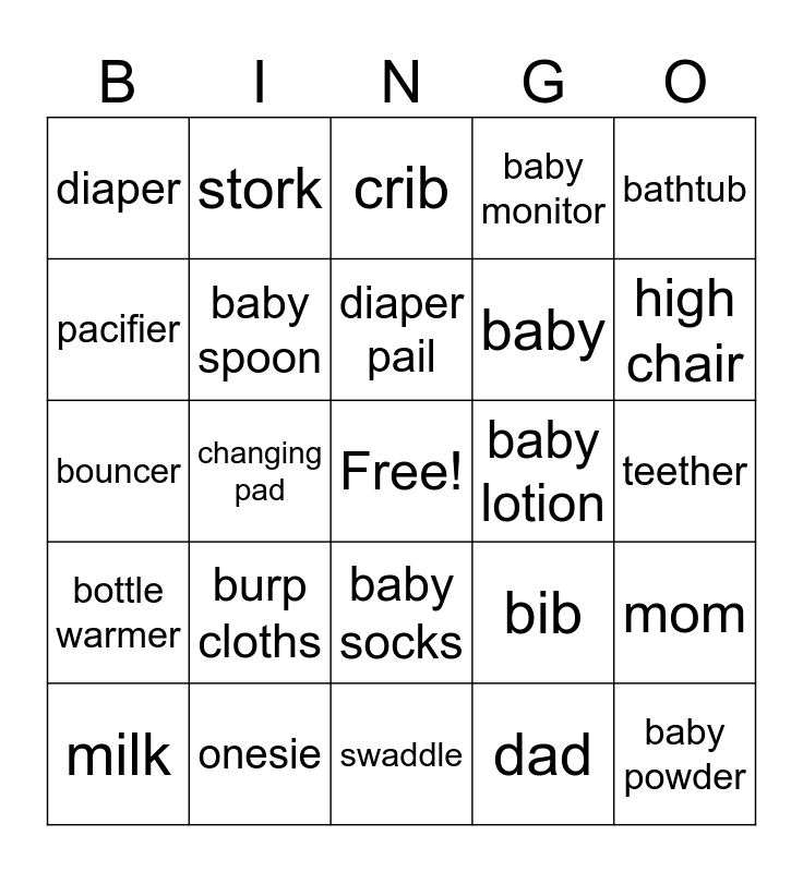 This bingo card has a free space and 40 words: bassinet, bouncer, baby hat, baby spoon, onesie, baby socks, diaper pail, sleep sack, bathtub, bottle warmer, changing pad, baby monitor, baby powder, teether, baby lotion, burp cloths, swing, diaper, wipes, crib, mom, dad, baby, pacifier, stoller, car seat, playpen, boy, toys, books, rhyme, milk, bottle, bib, high chair, swaddle, blanket, nursery, stork and rattle.