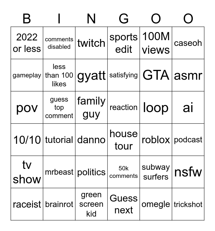 This bingo card has 36 words: 50k comments, politics, Guess next, gameplay, 10/10, reaction, less than 100 likes, green screen kid, 100M views, subway surfers, asmr, sports edit, nsfw, guess top comment, satisfying, 2022 or less, tv show, loop, pov, twitch, family guy, tutorial, house tour, danno, roblox, comments disabled, GTA, brainrot, gyatt, caseoh, trickshot, raceist, podcast, ai, mrbeast and omegle.