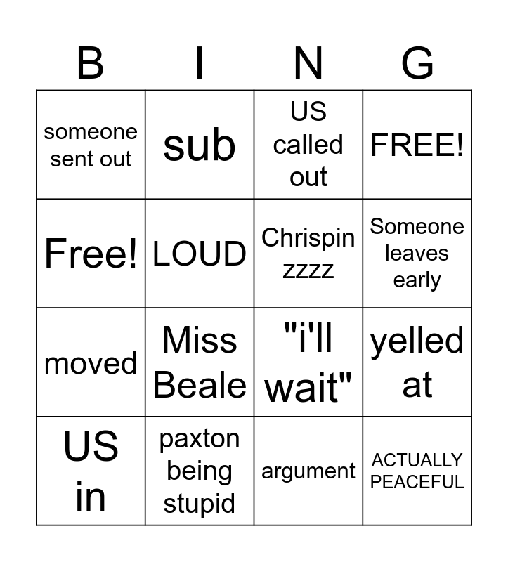 This bingo card has 16 words: paxton being stupid, yelled at, US called out, someone sent out, moved, sub, "i'll wait", argument, Free!, LOUD, US in, FREE!, Miss Beale, Someone leaves early, Chrispin zzzz and ACTUALLY PEACEFUL.