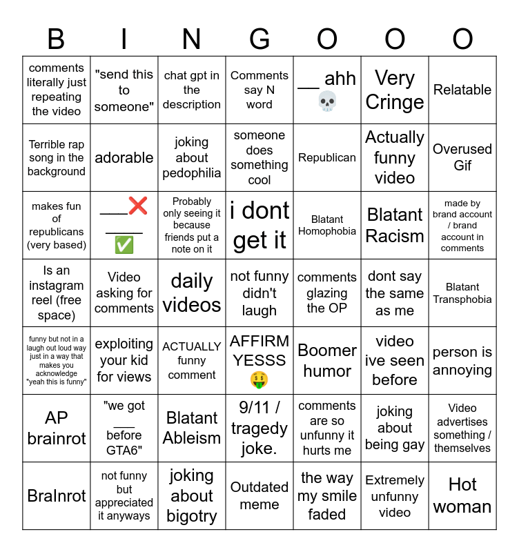 This bingo card has 50 words: Video advertises something / themselves, Actually funny video, Extremely unfunny video, Video asking for comments, Probably only seeing it because friends put a note on it, AFFIRM YESSS 🤑, "send this to someone", Outdated meme, Very Cringe, Boomer humor, Relatable, Comments say N word, Blatant Racism, Blatant Homophobia, Blatant Ableism, Blatant Transphobia, Terrible rap song in the background, Overused Gif, BraInrot, __ ahh 💀, Republican, daily videos, comments literally just repeating the video, adorable, not funny but appreciated it anyways, not funny didn't laugh, joking about pedophilia, joking about bigotry, chat gpt in the description, i dont get it, funny but not in a laugh out loud way just in a way that makes you nose exhale, funny but not in a laugh out loud way just in a way that makes you acknowledge "yeah this is funny", "we got ___ before GTA6", 9/11 / tragedy joke., Is an instagram reel (free space), dont say the same as me, video ive seen before, person is annoying, AP brainrot, makes fun of republicans (very based), ACTUALLY funny comment, comments are so unfunny it hurts me, exploiting your kid for views, the way my smile faded, made by brand account / brand account in comments, someone does something cool, comments glazing the OP, joking about being gay, ___❌ ____ ✅ and Hot woman.