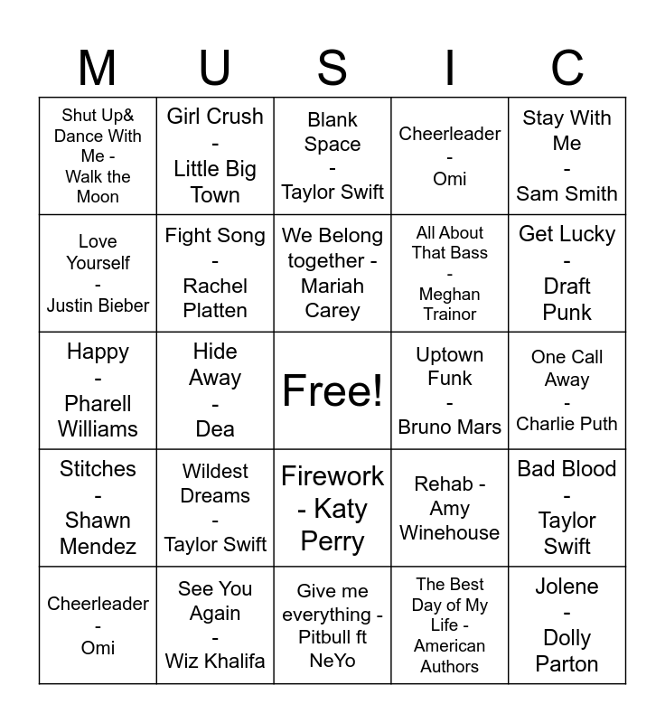 This bingo card has a free space and 24 words: Wildest Dreams - Taylor Swift, See You Again - Wiz Khalifa, We Belong together - Mariah Carey, Cheerleader - Omi, Stay With Me - Sam Smith, Shut Up& Dance With Me - Walk the Moon, Love Yourself - Justin Bieber, Girl Crush - Little Big Town, Uptown Funk - Bruno Mars, Firework - Katy Perry, All About That Bass - Meghan Trainor, Happy - Pharell Williams, Rehab - Amy Winehouse, Bad Blood - Taylor Swift, Fight Song - Rachel Platten, The Best Day of My Life - American Authors, One Call Away - Charlie Puth, Blank Space - Taylor Swift, Get Lucky - Draft Punk, Hide Away - Dea, Jolene - Dolly Parton, Stitches - Shawn Mendez, Cheerleader - Omi and Give me everything - Pitbull ft NeYo.