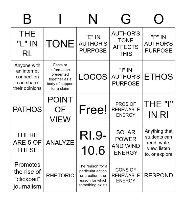 This bingo card has a free space and 24 words: ANALYZE, RHETORIC, LOGOS, Promotes the rise of "clickbait" journalism, "P" IN AUTHOR'S PURPOSE, THE "L" IN RL, Anyone with an internet connection can share their opinions, TONE, PROS OF RENEWABLE ENERGY, RI.9-10.6, "I" IN AUTHOR'S PURPOSE, PATHOS, SOLAR POWER AND WIND ENERGY, Anything that students can read, write, view, listen to, or explore, Facts or information presented together as a body of support for a claim, CONS OF RENEWABLE ENERGY, THE "I" IN RI, "E" IN AUTHOR'S PURPOSE, ETHOS, POINT OF VIEW, RESPOND, THERE ARE 5 OF THESE, AUTHOR'S TONE AFFECTS THIS and The reason for a particular action or creation; the reason for which something exists.