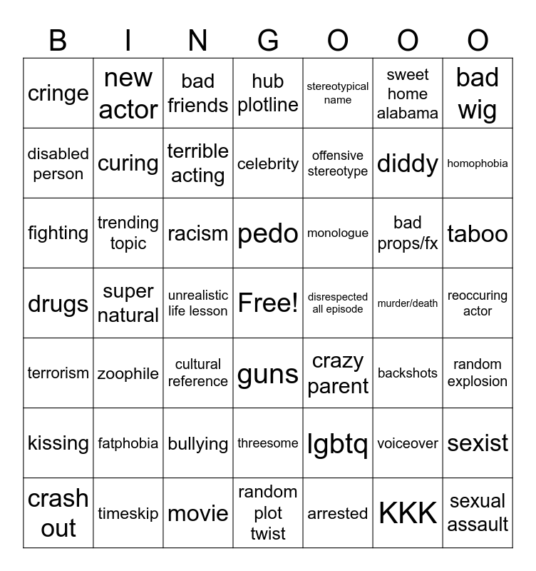 This bingo card has a free space and 48 words: lgbtq, diddy, random plot twist, super natural, racism, reoccuring actor, new actor, timeskip, sweet home alabama, guns, bad wig, hub plotline, bad props/fx, monologue, kissing, murder/death, disabled person, homophobia, voiceover, stereotypical name, offensive stereotype, unrealistic life lesson, cringe, curing, sexist, terrible acting, taboo, crash out, pedo, trending topic, KKK, disrespected all episode, random explosion, fatphobia, drugs, crazy parent, backshots, fighting, cultural reference, bullying, terrorism, sexual assault, bad friends, movie, celebrity, threesome, zoophile and arrested.
