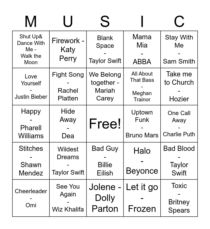 This bingo card has a free space and 24 words: Wildest Dreams - Taylor Swift, See You Again - Wiz Khalifa, We Belong together - Mariah Carey, Cheerleader - Omi, Stay With Me - Sam Smith, Shut Up& Dance With Me - Walk the Moon, Love Yourself - Justin Bieber, Firework - Katy Perry, Uptown Funk - Bruno Mars, Bad Guy - Billie Eilish, All About That Bass - Meghan Trainor, Happy - Pharell Williams, Halo - Beyonce, Bad Blood - Taylor Swift, Fight Song - Rachel Platten, Let it go - Frozen, One Call Away - Charlie Puth, Blank Space - Taylor Swift, Take me to Church - Hozier, Hide Away - Dea, Toxic - Britney Spears, Stitches - Shawn Mendez, Mama Mia - ABBA and Jolene - Dolly Parton.