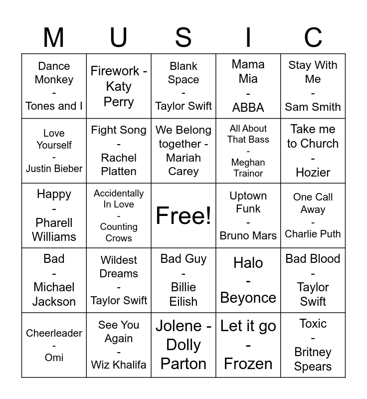 This bingo card has a free space and 24 words: Wildest Dreams - Taylor Swift, See You Again - Wiz Khalifa, We Belong together - Mariah Carey, Cheerleader - Omi, Stay With Me - Sam Smith, Dance Monkey - Tones and I, Love Yourself - Justin Bieber, Firework - Katy Perry, Uptown Funk - Bruno Mars, Bad Guy - Billie Eilish, All About That Bass - Meghan Trainor, Happy - Pharell Williams, Halo - Beyonce, Bad Blood - Taylor Swift, Fight Song - Rachel Platten, Let it go - Frozen, One Call Away - Charlie Puth, Blank Space - Taylor Swift, Take me to Church - Hozier, Accidentally In Love - Counting Crows, Toxic - Britney Spears, Bad - Michael Jackson, Mama Mia - ABBA and Jolene - Dolly Parton.