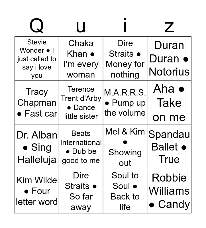 This bingo card has 64 words: Toto ● Africa, Fleetwood Mac ● Little lies, Tina Turner ● Private dancer, U2 ● I still haven't found, Culture Club ● Karma Chameleon, Westlife ● Uptown Girl, Chaka Khan ● I'm every woman, The Police ● Roxanne, Aha ● Take on me, Snap ● Oops up, UB 40 ● Sing our own song, Wham ● Wake me up before you gogo, Soul to Soul ● Back to life, Tracy Chapman ● Fast car, Bananarama ● Venus, Terence Trent d'Arby ● Dance little sister, Spandau Ballet ● True, Stevie Wonder ● I just called to say i love you, Robbie Williams ● Mr. Bojangels, Dr. Alban ● Sing Halleluja, Five Star ● All fall down, Robbie Williams ● Candy, Duran Duran ● Notorius, Snap ● Rhythm is a dancer, Princess ● Say i'm your number one, Queen ● I want to break free, Crystal Waters ● 100% pure love, Stevie Wonder ● Part time lover, David Bowie ● Dancing in the street, Janet Jackson ● Togheter again, Depeche Mode ● Enjoy the silence, Curiosity Killed The Cat ● Down to earth, Tears for Fears ● Shout, Nick Kamen ● I promised myself, Beats International ● Dub be good to me, Bill & Jennifer ● The time of my life, ABBA ● Money, money, money, Bee Gees ● How deep is your love, Rick Ashly ● Cry for help, M.A.R.R.S. ● Pump up the volume, Mel & Kim ● Showing out, Dire Straits ● So far away, Pet Shop Boys ● What have i done to deserve this, Tiffany ● I think we're alone now, Wet Wet Wet ● Angel Eyes, Kim Wilde ● Four letter word, Salt 'n Pepa ● Let's talk about seks, Kiss ● I was made for loving you, Yazz & The Plastic Population ● The only way is up, Michael Jackson ● Don't stop till you get enough, Technotronic ● Pump up the jam, Mel & Kim ● Respectable, Salt 'n Pepa ● Push it, Roxette ● It must have been love, Marillion ● Kayleigh, Patti Labelle ● On my own, Dire Straits ● Money for nothing, Madonna ● Borderline, Simple Minds ● Don't you, 10cc ● I'm not in love, KC & The Sunshine Band ● That's the way i like it, Simple Minds ● Alive and kicking, Simply Red ● You make me feel and Jason & Kylie ● Especially for you.