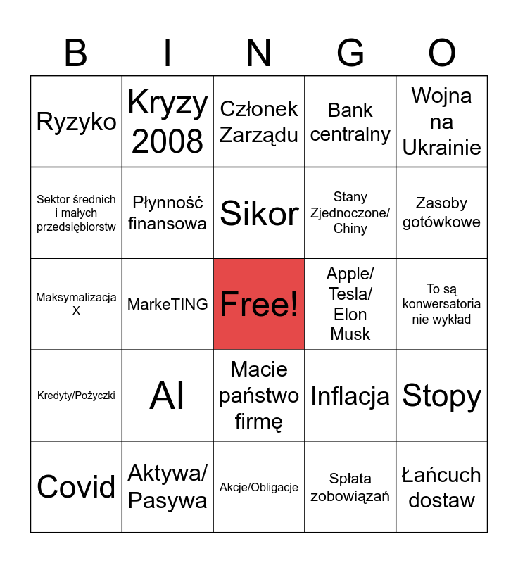 This bingo card has a free space and 24 words: AI, Aktywa/ Pasywa, Sikor, Covid, Wojna na Ukrainie, Ryzyko, Sektor średnich i małych przedsiębiorstw, Kryzy 2008, Apple/ Tesla/ Elon Musk, Macie państwo firmę, Stany Zjednoczone/ Chiny, Maksymalizacja X, Inflacja, Stopy, Płynność finansowa, Spłata zobowiązań, To są konwersatoria nie wykład, Członek Zarządu, Zasoby gotówkowe, MarkeTING, Łańcuch dostaw, Kredyty/Pożyczki, Bank centralny and Akcje/Obligacje.