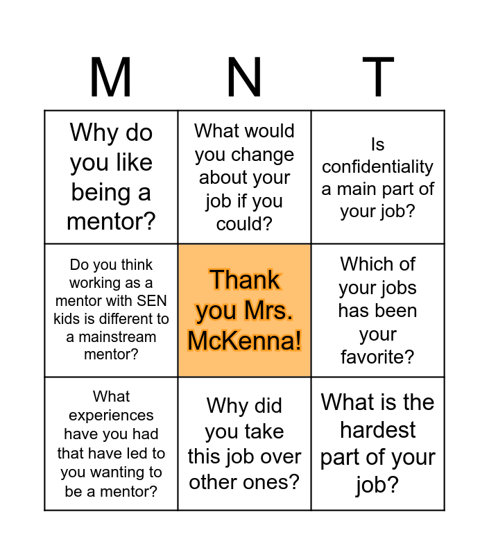 This bingo card has a free space and 17 words: Why is confidentiality important?, Give an example of when confidentiality was needed., Is confidentiality a main part of your job?, Why do you like being a mentor?, What is safeguarding, in your own words?, Do you think working as a mentor with SEN kids is different to a mainstream mentor?, What is your work history like?, What experiences have you had that have led to you wanting to be a mentor?, Why did you take this job over other ones?, Which of your jobs has been your favorite?, What’s it like having a job here at SOTS?, Have you worked in other schools?, What is the hardest part of your job?, What would you change about your job if you could?, What kind of students benefit from having a mentor?, What do you wish you could explain to everyone about being a mentor? and What are the most important skills used in mentoring?.