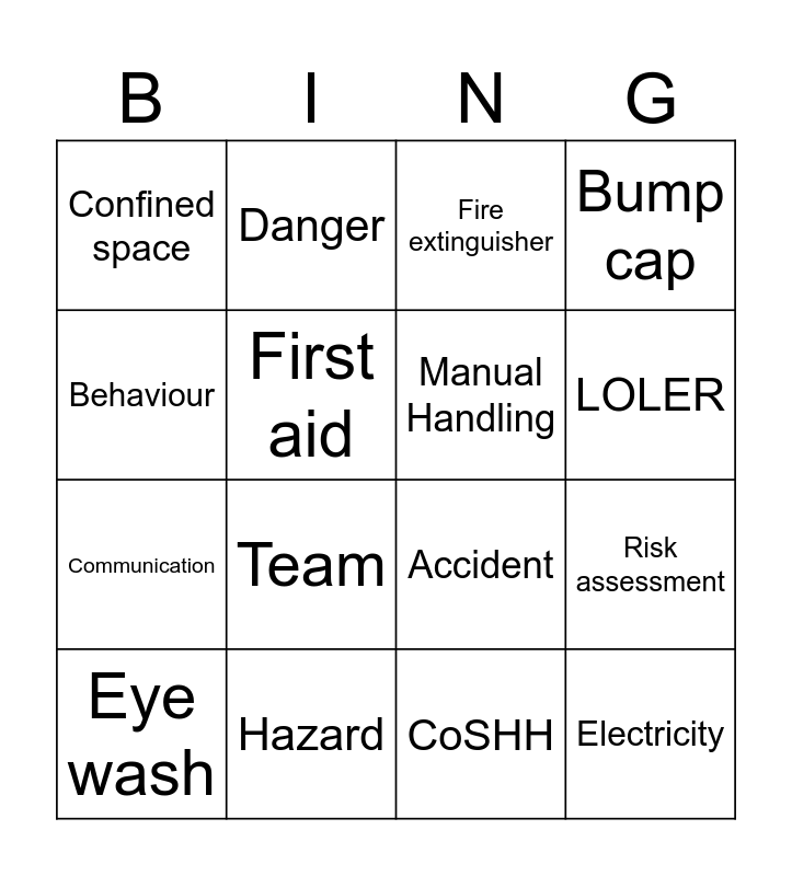 This bingo card has 16 words: Hazard, Risk assessment, Fire extinguisher, Confined space, Communication, Danger, Accident, CoSHH, Behaviour, First aid, Eye wash, Bump cap, Team, LOLER, Manual Handling and Electricity.