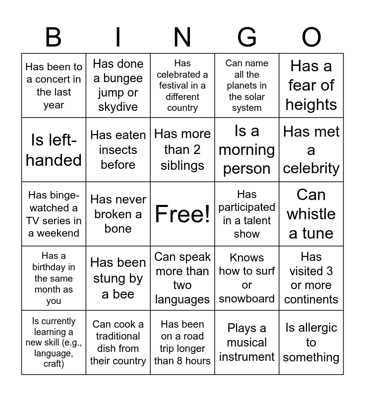 This bingo card has a free space and 24 words: Has been stung by a bee, Can cook a traditional dish from their country, Has more than 2 siblings, Is currently learning a new skill (e.g., language, craft), Has a fear of heights, Has been to a concert in the last year, Is left-handed, Has done a bungee jump or skydive, Has participated in a talent show, Can speak more than two languages, Is a morning person, Has binge-watched a TV series in a weekend, Knows how to surf or snowboard, Has visited 3 or more continents, Has eaten insects before, Plays a musical instrument, Can whistle a tune, Has celebrated a festival in a different country, Has met a celebrity, Has never broken a bone, Is allergic to something, Has a birthday in the same month as you, Can name all the planets in the solar system and Has been on a road trip longer than 8 hours.