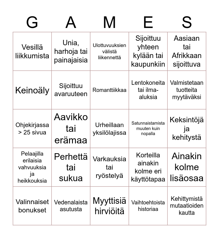 This bingo card has 106 words: Free!, Julkaistu 2024, Aasiaan tai Afrikkaan sijoittuva, Kirjasto tai arkisto, Sijoittuu vuoristoon, Nimessä vain yksi sana, Toimitaan taidekentällä, Sarjan tai kampanjan osa, Vaihtoehtoinen energiamuoto, Pelaajavärit eivät päävärejä, Klassisen pelin adaptaatio, Salainen agenda, Kapina tai vallankumous, Viisi vuotta ilman lisäosia, Uhkaava ekokatastrofi tai maailmanlopppu, Kasvillisuus keskeistä, Ulottuvuuksien välistä liikennettä, Nimessä henkilön nimi, Historiallinen tapahtuma, Voi käyttää keihästä, Varkauksia tai ryöstelyä, Vandalismia tai terrorismia, Vapaa-ajan viettoa, Kartoittamattomia alueita, Omaperäinen pisteytys, Perhettä tai sukua, Valmistetaan tuotteita myytäväksi, Sijoittuu yhteen kylään tai kaupunkiin, Esihistoriallisia eläimiä, Raideliikennettä, Korteilla ainakin kolme eri käyttötapaa, Vaihtoehtoista historiaa, Julkaistu 1990-luvulla, Lunta ja jäätä, Eläviä kuolleita tai kuolleiden herättämistä, Sijoittuu kouluun tai oppilaitokseen, Pelin nimessä on numero, Eläinkumppani, Romanttiikkaa, Pelatessa naurattaa, Kattava taustatarina tai mytologia, Pelaajilla yliluonnollisia kykyjä, Kehittymistä mutaatioiden kautta, Pelaajilla erilaisia vahvuuksia ja heikkouksia, Nimessä ainakin kahdeksan sanaa, Keinoäly, Tunnettu fantasiahahmo, Vesillä liikkumista, Liittyy sarjakuvaan, Urheillaan yksilölajissa, Suomalainen suunnittelija, Vedenalaista asutusta, Hyönteisiä tai matelijoita, Örkkejö, peikkoja tai jättiläisiä, Eldrich-mythos, Mielenterveys mekanismina, Luonnonvoimia tai vuodenaikoja, Magiaa hyvän tekemisessä, Pelisarjan ensimmäinen, Unia, harhoja tai painajaisia, Rikollisuutta tai jengejä, Pelaajat ei-ihmisiä, Kuusikulmaisia laattoja, 3D-komponentteja, Raskasta teollisuutta, Perustarpeista huolehtimista, Infrastruktuurin suunnittelua, Liittoutumia tai juonittelua, Lentokoneita tai ilma-aluksia, Ohjekirjassa > 25 sivua, Aavikko tai erämaa, Myyttisiä hirviöitä, Hahmot eri-ikäisiä, Joukkorahoitettu, Miekka ja magia, Lajien välisiä suhteita, Peliaika yli kolme tuntia, Laskutoimituksia, Set up vaihtelee, Turhan suuri laatikko, Maalauksellinen estetiikka, Opettavaisia faktoja, Aliarvostettu peli, Satuhahmoja, Realistiset sotavoimat, Ekosysteemin tasapainottamista, Satunnaistamista muuten kuin nopalla, Laatikko muu kuin kuusitahokas, Vuorokauden- tai vuodenaikoja, Joukkuepeli, Yhteistyöpeli, Temaattisesti eheä, Useita palkintoja, BGG-complexity yli 4/5, Uskonnollisia teemoja, Ainakin kolme lisäosaa, Kauhua tai hirviöitä, Uudisraivaajia tai kolonialismia, Supersankareita, Keksintöjä ja kehitystä, Sijoittuu avaruuteen, Erilaisia noppia, Omaperäinen taistelumekaniikka, Omia tavoitteita, Valinnaiset bonukset and Loukkaantuminen heikentää.