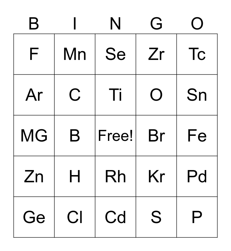 This bingo card has a free space and 24 words: H, Cl, Ti, Ge, Tc, F, Ar, Mn, Br, Rh, O, MG, Kr, Pd, C, S, Fe, Se, Sn, B, P, Zn, Zr and Cd.