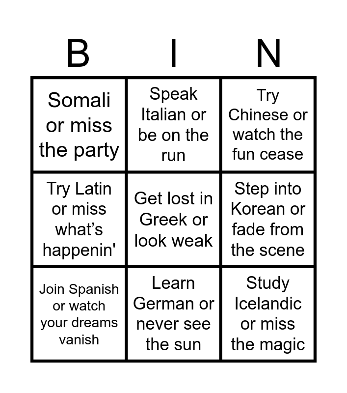 This bingo card has 16 words: Sing in Hindi or feel gritty, Unravel Dutch or let joy lose its touch, Try Chinese or watch the fun cease, Somali or miss the party, Study Icelandic or miss the magic, Speak Italian or be on the run, Master Swedish or risk a wish, Venture into Russian or face a language harm, Get lost in Greek or look weak, Step into Korean or fade from the scene, Explore Arabic or see the joy turn tragic, Try Latin or miss what’s happenin', Dive into Norwegian or face a winter's alarm, Learn German or never see the sun, Join Spanish or watch your dreams vanish and Conquer French or feel the clenchץ.