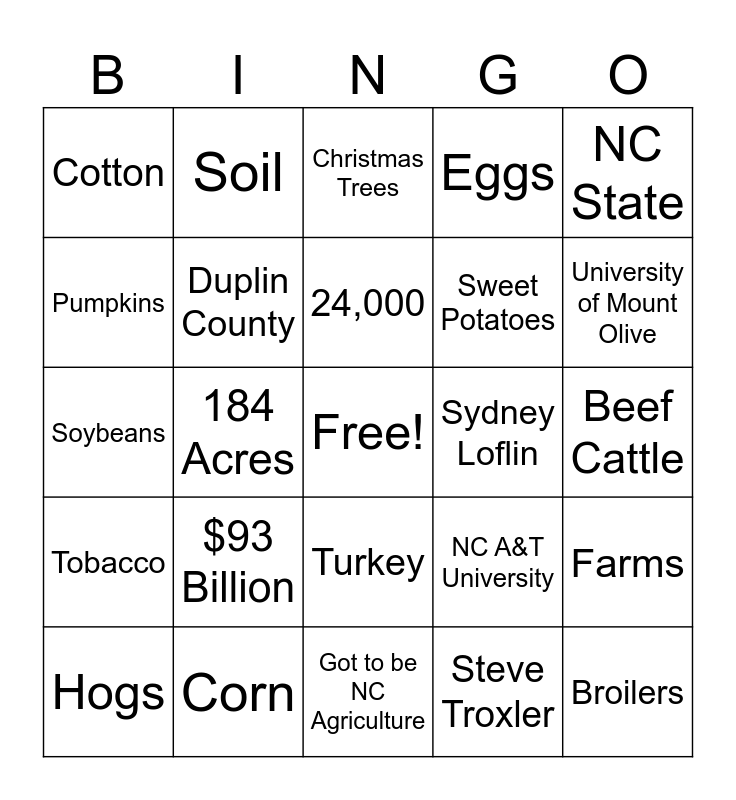 This bingo card has a free space and 24 words: $93 Billion, Corn, 24,000, Hogs, NC State, Cotton, Pumpkins, Soil, Sydney Loflin, Turkey, Sweet Potatoes, Soybeans, NC A&T University, Farms, Duplin County, Steve Troxler, Beef Cattle, Christmas Trees, University of Mount Olive, 184 Acres, Broilers, Tobacco, Eggs and Got to be NC Agriculture.