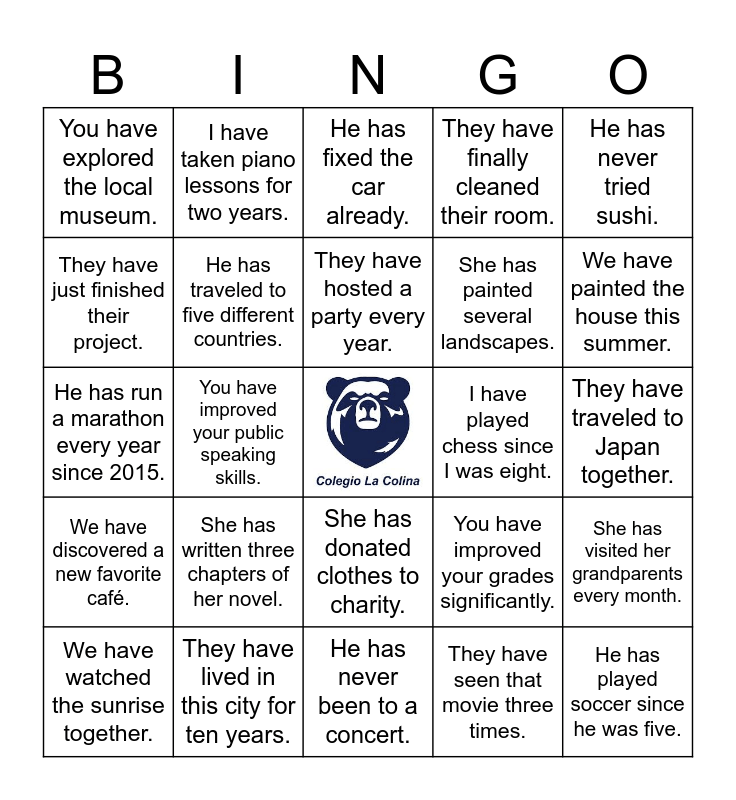 This bingo card has a free space and 42 words: We have shared many wonderful memories., They have hosted a party every year., She has completed her homework., She has written three chapters of her novel., They have seen that movie three times., She has visited her grandparents every month., He has played soccer since he was five., I have been to that park many times., He has fixed the car already., She has donated clothes to charity., They have traveled to Japan together., We have painted the house this summer., You have improved your public speaking skills., He has never tried sushi., We have eaten at that restaurant before., You have improved your grades significantly., I have visited the Grand Canyon., He has run a marathon every year since 2015., You have written a letter to your pen pal., I have taken piano lessons for two years., They have just finished their project., I have watched that series on Netflix., You have read this book already., You have explored the local museum., We have attended that concert twice., You have made a great impression., She has painted several landscapes., She has participated in three art contests., She has completed her science project., I have enjoyed this class so much!, They have made a documentary about wildlife., We have discovered a new favorite café., He has traveled to five different countries., He has never been to a concert., I have met his family before., We have watched the sunrise together., They have lived in this city for ten years., I have played chess since I was eight., He has gone hiking in the mountains., He has cooked dinner for us several times., They have finally cleaned their room. and She has learned to play the guitar..