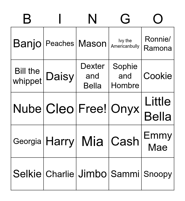 This bingo card has a free space and 24 words: Harry, Charlie, Dexter and Bella, Selkie, Ronnie/ Ramona, Banjo, Bill the whippet, Peaches, Onyx, Mia, Sophie and Hombre, Nube, Cash, Emmy Mae, Daisy, Sammi, Little Bella, Mason, Cookie, Cleo, Snoopy, Georgia, Ivy the Americanbully and Jimbo.