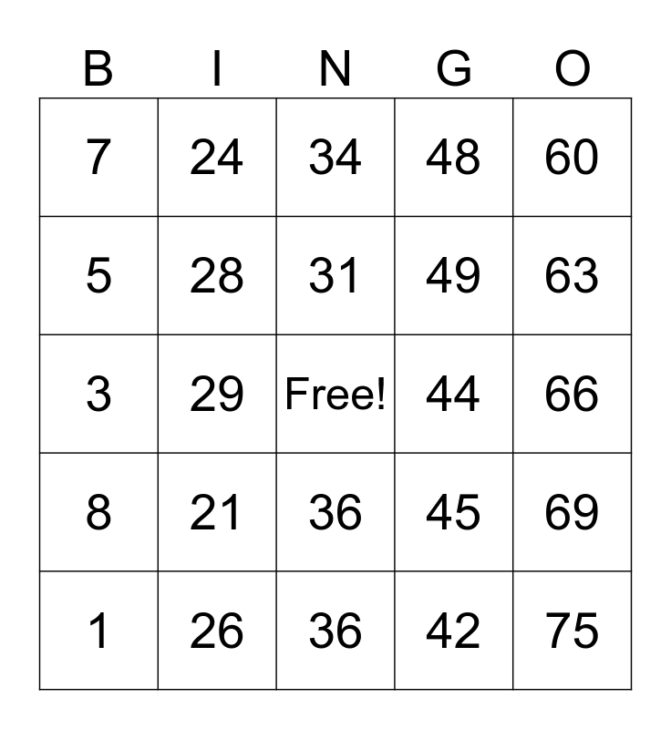 This bingo card has a free space and 24 words: 1, 21, 31, 42, 60, 7, 24, 34, 44, 66, 3, 28, 45, 69, 5, 26, 36, 48, 63, 8, 29, 36, 49 and 75.