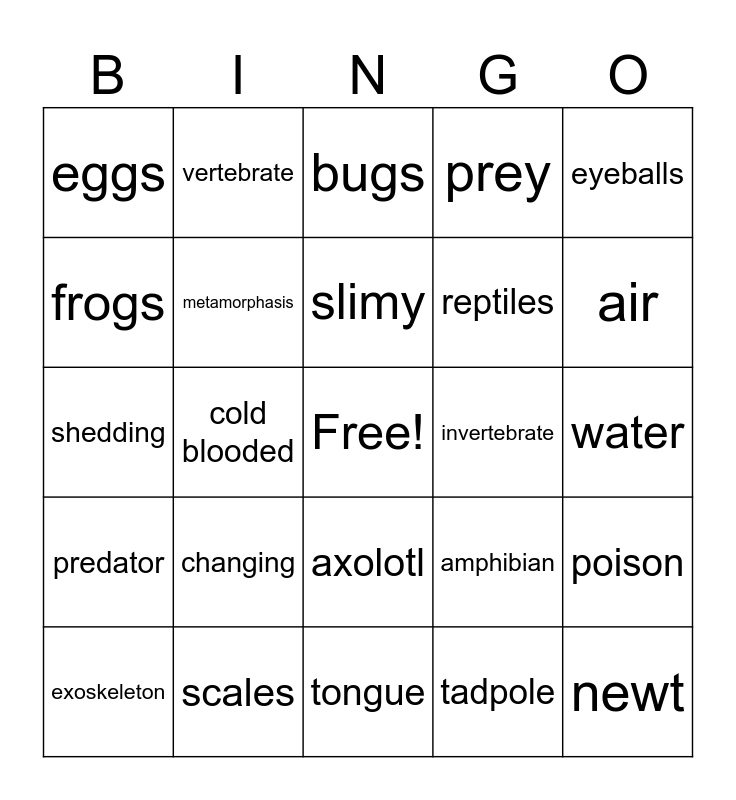 This bingo card has a free space and 24 words: changing, scales, slimy, exoskeleton, eyeballs, eggs, frogs, vertebrate, invertebrate, axolotl, reptiles, shedding, amphibian, poison, metamorphasis, tadpole, water, bugs, air, cold blooded, newt, predator, prey and tongue.