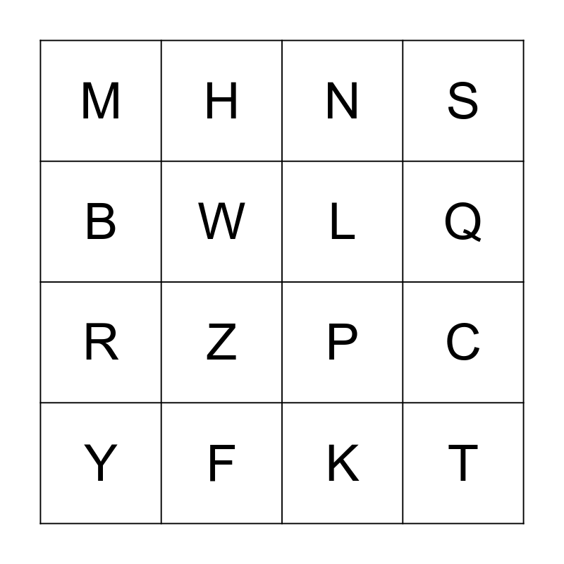This bingo card has 21 words: F, G, H, J, K, L, M, N, P, Q, R, S, T, V, W, X, Y, Z, B, C and D.