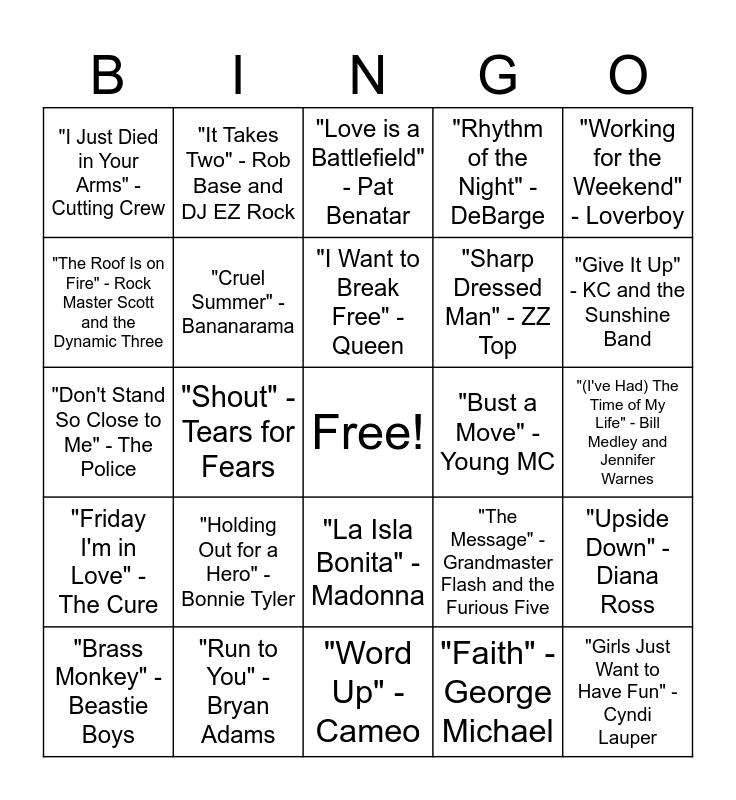 This bingo card has a free space and 41 words: “We’re Not Gonna Take It” – Twisted Sister, "Don't Stand So Close to Me" - The Police, "Ghostbusters" - Ray Parker Jr., "Cruel Summer" - Bananarama, "Run to You" - Bryan Adams, "La Isla Bonita" - Madonna, "I Want to Break Free" - Queen, "Higher Love" - Steve Winwood, "Working for the Weekend" - Loverboy, "Friday I'm in Love" - The Cure, "Shout" - Tears for Fears, "Rhythm of the Night" - DeBarge, "Girls Just Want to Have Fun" - Cyndi Lauper, "(I've Had) The Time of My Life" - Bill Medley and Jennifer Warnes, "Bust a Move" - Young MC, "Holding Out for a Hero" - Bonnie Tyler, "Walk Like an Egyptian" - The Bangles, "I Just Died in Your Arms" - Cutting Crew, "Super Trouper" - ABBA, "Love is a Battlefield" - Pat Benatar, "Upside Down" - Diana Ross, "Let's Dance" - David Bowie, "Word Up" - Cameo, "Sharp Dressed Man" - ZZ Top, "Venus" - Bananarama, "Flashdance... What a Feeling" - Irene Cara, "Faith" - George Michael, "It's Tricky" - Run DMC, "Give It Up" - KC and the Sunshine Band, "Fight for Your Right" - Beastie Boys, "Apache" - The Sugarhill Gang, "It Takes Two" - Rob Base and DJ EZ Rock, "Brass Monkey" - Beastie Boys, "Rapper's Delight" - The Sugarhill Gang, "The Message" - Grandmaster Flash and the Furious Five, "The Roof Is on Fire" - Rock Master Scott and the Dynamic Three, "Planet Rock" - Afrika Bambaataa, "Lookout Weekend" - Debbie Deb, "Girls" - Beastie Boys, "You Sexy Thing" - Hot Chocolate and "She Drives Me Crazy" - Fine Young Cannibals.