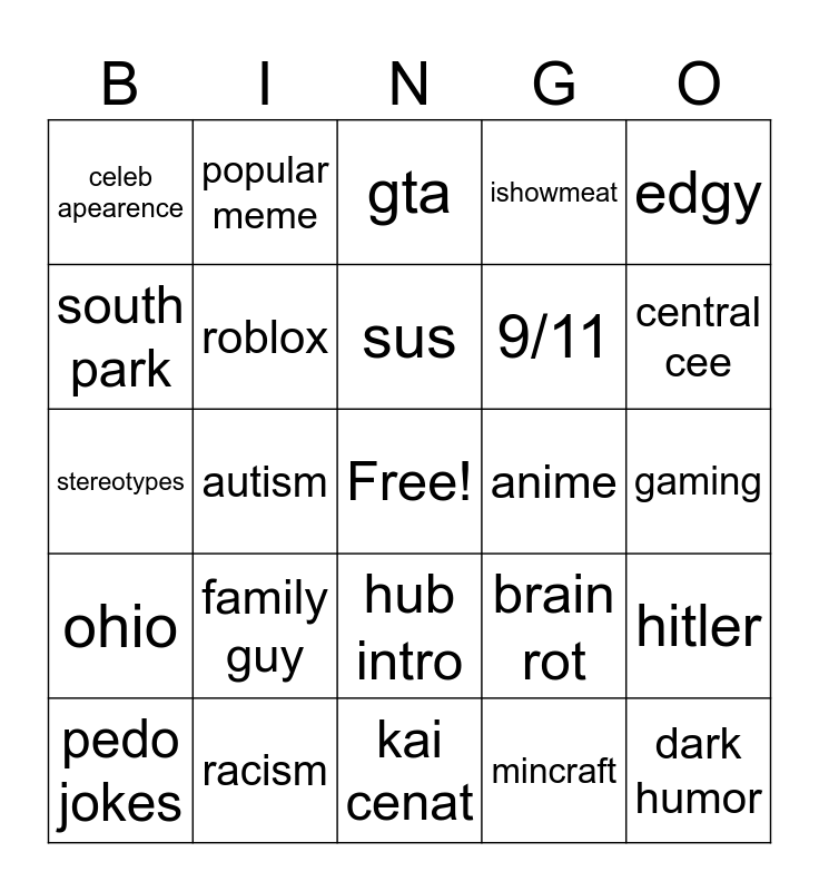 This bingo card has a free space and 24 words: family guy, racism, sus, pedo jokes, edgy, celeb apearence, south park, popular meme, anime, hub intro, 9/11, stereotypes, brain rot, hitler, roblox, mincraft, gaming, gta, central cee, autism, dark humor, ohio, ishowmeat and kai cenat.