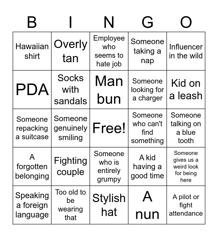 This bingo card has a free space and 24 words: Fighting couple, Too old to be wearing that, Man bun, Speaking a foreign language, Influencer in the wild, Hawaiian shirt, PDA, Overly tan, Someone who can't find something, Someone who is entirely grumpy, Someone looking for a charger, Someone repacking a suitcase, A kid having a good time, Someone gives us a weird look for being here, Socks with sandals, A nun, Someone talking on a blue tooth, Employee who seems to hate job, Kid on a leash, Someone genuinely smiling, A pilot or fight attendance, A forgotten belonging, Someone taking a nap and Stylish hat.