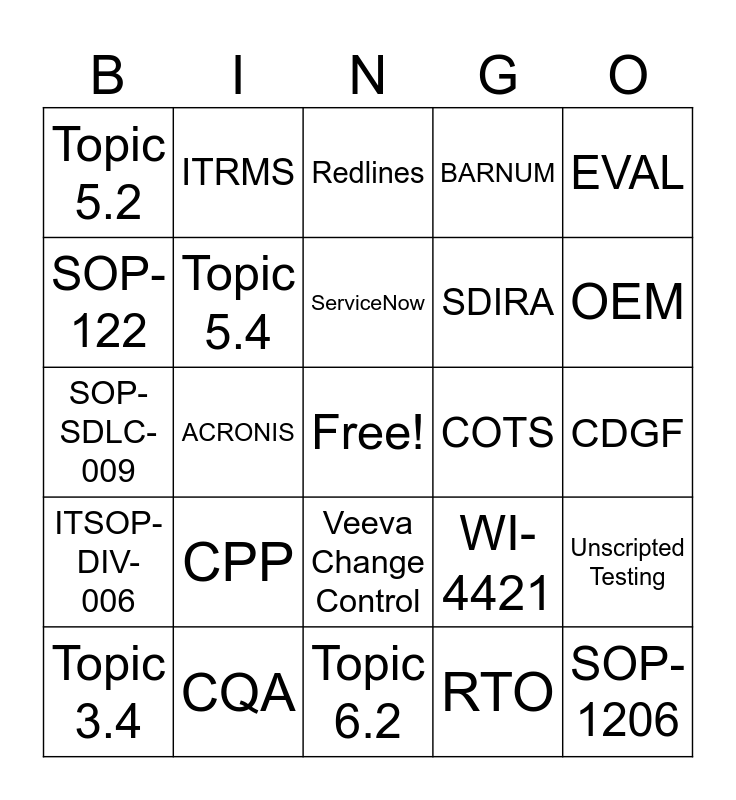 This bingo card has a free space and 57 words: Topic 3.2, Topic 3.4, Topic 3.5, Topic 5.2, Topic 6.2, Topic 7.2, Topic 5.4, QMS, SDIRA, DISC, BARNUM, SDLC, SLIA, SEF, QN, TER, EVAL, ACRONIS, COMMVAULT, SOP-1206, COTS, CSA, WI-4421, Redlines, QASR, ServiceNow, ACP, QBMS, OEM, OneCQV, Digitier, HPRA, FDA, ANVISA, CDGF, SOP-122, SOP-053, SOP-SDLC-009, CSI, ITSOP-DIV-006, ITRMS, Veeva Change Control, IPI Change Control, SbC, Backup, Archive, CPP, CQA, DME, TEL, RPO, RTO, SDLC-SOP-011, Periodic Review, Performance Management, Unscripted Testing and WI-206.